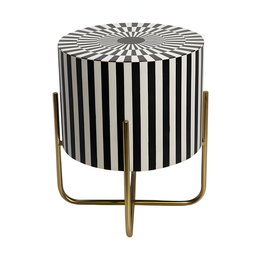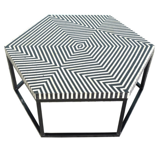 Bone Inlay Hexagonal Coffee Table in Black & White Stripe Design with Metal Based
