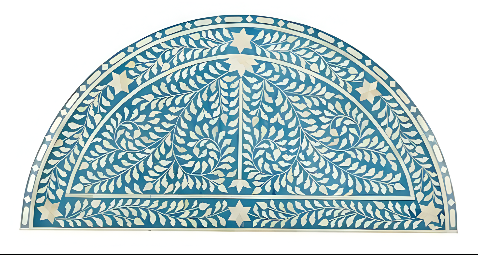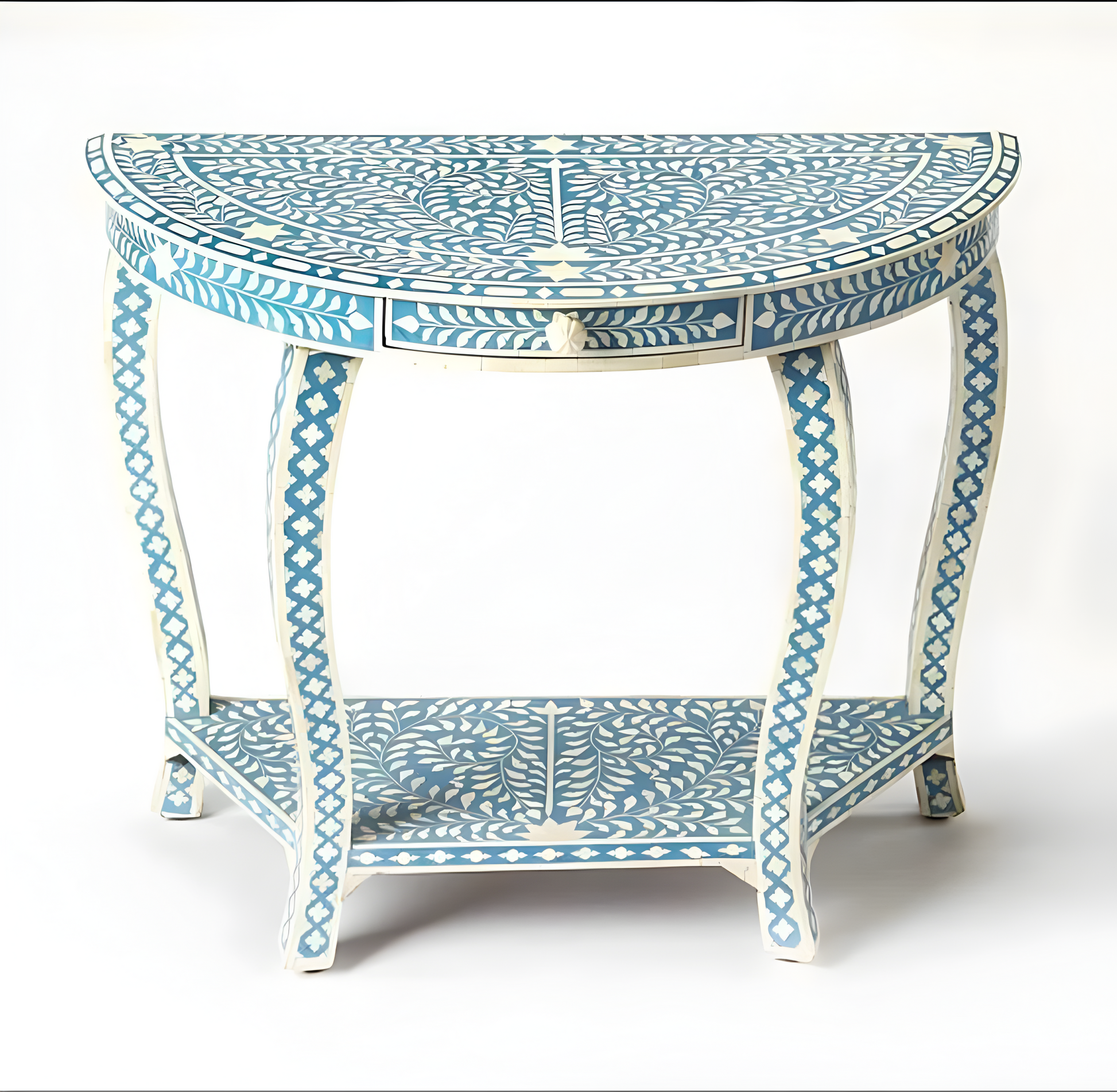 This Demilune console table with intricate bone inlays is a piece of functional art. Crafted from meranti wood solids resin and wood products by highly skilled artisans it boasts a captivating botanic pattern formed from thousands of hand-cut and painstakingly shaped pieces of bone inlaid against a sea of blue. A beautiful addition in the living room hallway or entryway it features a small storage drawer and bottom display shelf.